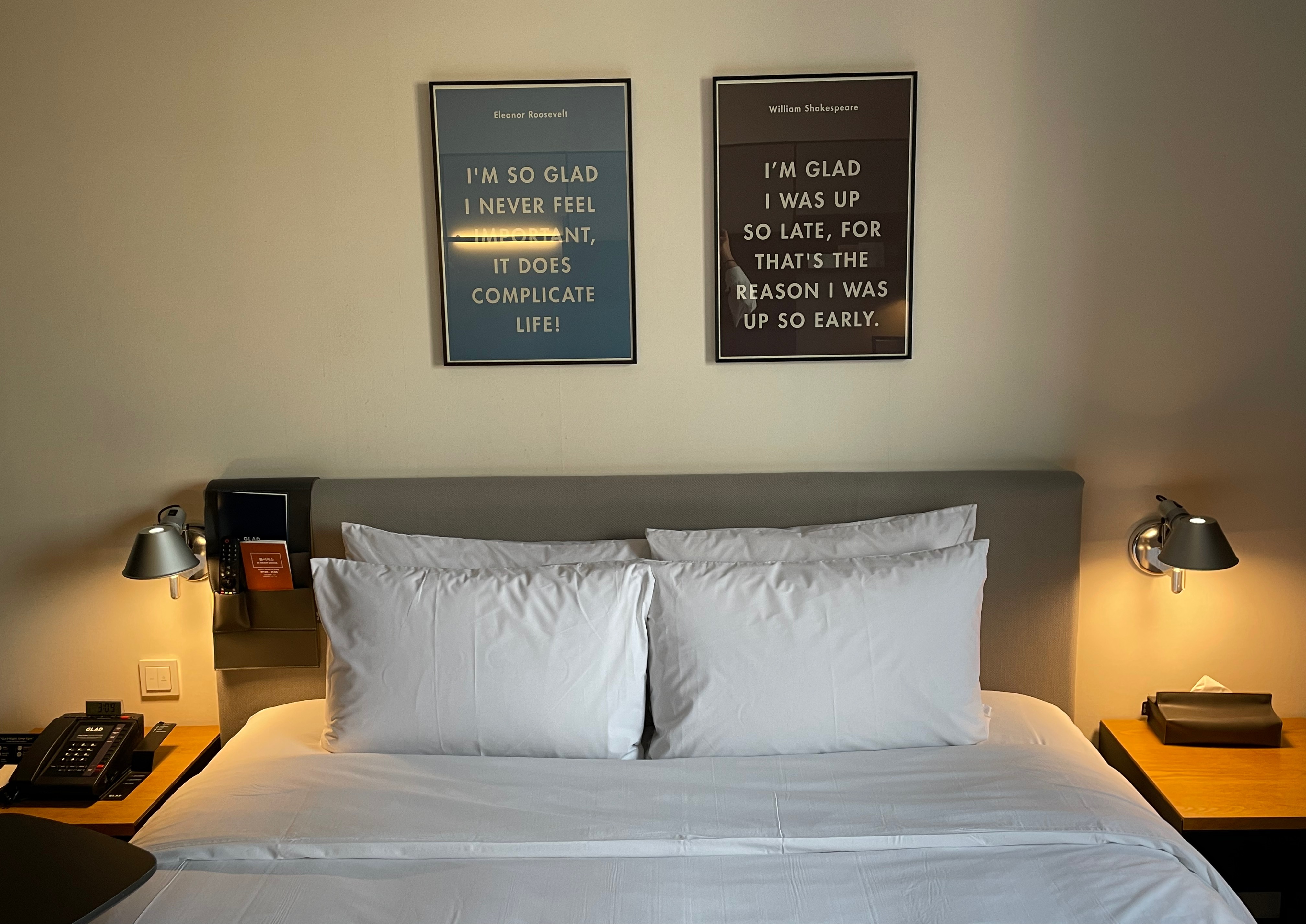 푹신푹신한 호텔 침대에서 편안하게 쉬고 싶다는 생각이 들어서.
